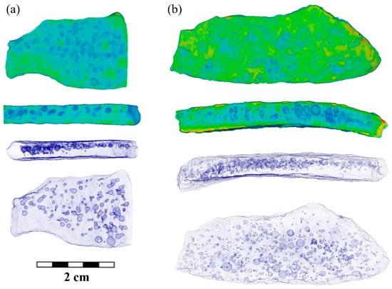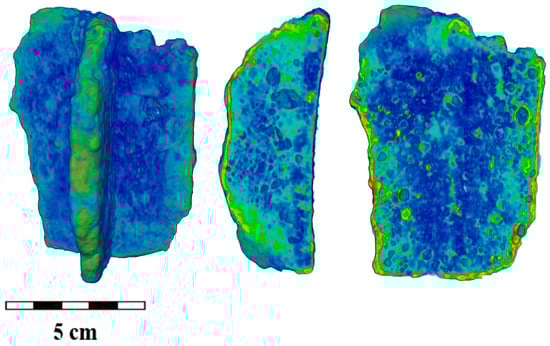 Observed small pores may occur during the casting of medieval products, and their formation can be associated with two processes when cooling a cast iron product. There is a formation of various phases in the Fe-C system [,,,], including graphite from excess carbon content, and the uneven cooling of the cast of cauldrons. It is known that molds made of a densified sand–clay mixture were used for casting cauldrons [,]. These occurred in the solid–liquid state of iron in the temperature range between liquidus and solidus points [,]. Therefore, we should expect an uneven spatial distribution within the volume of cast iron fragments. Indeed, a preferential appearance of pores near the outer side of the cauldron fragment was found. Examples of the characteristically reconstructed 3D models for fragments BS-65 and SS-5 are shown in Figure 9a,b, respectively.