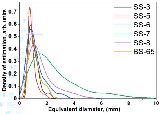 In the first view, a high porosity is observed only in the fragments from the Selitrennoye settlement; simultaneously, the samples from the Bulgar area have almost no internal large pores, except for the BS-65 sample. As an intermediate conclusion, the presence or absence of pores inside the volume of the archaeological cast iron materials or products can be distinguished as a structural marker. The algorithms and calculations for analyzing the 3D models of the fragments make it possible to obtain some morphological parameters of separated pores, as well as their mutual spatial orientation. The sizes of pores were estimated using the equivalent diameter parameter, which corresponds to the diameter of a sphere with the same volume as a pore []. The obtained distributions of the equivalent diameters of the pores for samples SS-3, SS-5, SS-6, SS-7, SS-8, and BS-65 are presented in Figure S2. Most of the pore sizes fall into the range of 0.8–2 mm, but several large pores are in the range of 5–8 mm. It should be noted that the presence of a great number of small pores in the cast iron fragment BS-65 from Bulgar was observed. It is assumed that the corresponding cauldron could have been brought through the river trade route [,], which was actively developing at this time. However, the statistical sampling is very low, so it is redundant to draw more accurate conclusions. For a more detailed analysis of the pore size distributions, we used the approximation of experimental data using the probability density function with a non-parametric estimation method for kernel density estimation with Silverman bandwidth [,,]. In the frame of this approach, we can compare the calculated distributions from sample to sample. The calculated approximating curves are shown in Figure 5. It can be seen that the narrowest distribution is characteristic of the sample SS-5. Interestingly, for other samples, there is an expansion in the approximation curves with a corresponding shift into the large size range of the average equivalent diameter of the segmented pores (Figure 5). If the broadening in the size distribution indicates an increase in pore origin variability in the thickness of cast iron fragments, then the appearance of additional peaks on the approximation curves may indicate the existence of some large cavities or voids. These voids can be aggregated by smaller pores or have a different nature of formation. We assume that such large voids can result from intensive gas extraction from additional admixed components (slags) in the cast iron material [,] due to variations in ore crushing and features of ore putting in a melting forge. Note that such large voids are characteristic not only of the fragments from the Selitrennoye settlement but also of the more structurally uniform samples from the Bolgar area.