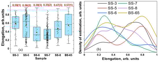 (a) A box-view presentation showing the distribution of elongation parameters for selected cast iron fragments. The points are experimental data from the analysis of the 3D models, and the red dots are the mean value of the elongation parameters. These parameters are labeled at the top. The horizontal lines inside the boxes correspond to the median value of the elongation parameter. (b) The distribution of elongation of the pores in the cast iron fragments shown as the normal distribution approximation with Kernel Smooth mode.