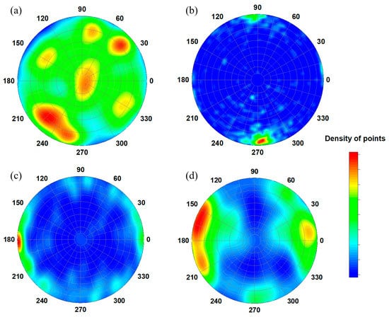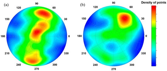 We mentioned above that the size distributions and elongation parameters indicate at least two groups or types of internal pores in the volume of cast iron products. A similar situation is observed for the orientation of pores in the cast iron fragments. The comparative pole figures for the orientation of small pores (<10 mm) and large ones (>10 mm) are shown in Figure 8a,b, respectively.