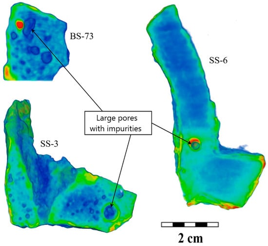 More interesting is the fact that both the size and elongation distributions, as well as direct observation, distinguish the presence of large pores or cavities. This is the so-called gas–shrinkage porosity [,,]. When the raw material is milled and loaded into the forge, the small particles of ore matter can get into the fusion matter and can serve as a source of accompanied gas during the melting process. Moreover, if large cavities along with small pores exist in the objects from the Selitrennoye settlement, then only large pores are observed in the cast iron fragments from the Bolgar settlement (Figure S1). Several enlarged slices of the 3D models of the cast iron fragments in the area with large pores are shown in Figure 10. It can be seen that some structural elements with a different neutron attenuation coefficient in comparison with cast iron material were visible next to the large pores. This can be relatively large inclusions from a clay–sand mold for cauldrons.