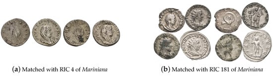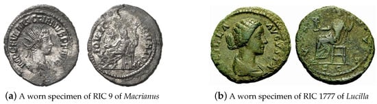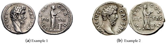 Considering the inherently interdisciplinary focus of the present article, for the sake of clarity it is useful right at the start to introduce and define a few specialist terms from the vernacular of ancient numismatics, lest there be any confusion over their meaning due to their different use in everyday language. When referring to a “coin”, the reference is made to a specific and unique physical specimen. It is important to distinguish it from an “issue”, a more abstract notion that engenders all possible coins with the semantically identical design motifs. For example, two Roman Imperial coins may be said to correspond to the same issue if the same emperor, clothed in and oriented in a particular way, etc., is depicted on the obverse, and when the same inscriptions, and, say, deities in the identical poses and engaged in identical acts, etc., are shown on the reverse. Different issues of coins are uniquely referred by their identifiers from a variety of standard references, such as the Roman Imperial Coinage (RIC), as illustrated in Figure 1. A thorough summary of the relevant terminology for the non-specialist can be found in the recent review of computer vision challenges and problems in ancient numismatics by Arandjelović and Zachariou [].