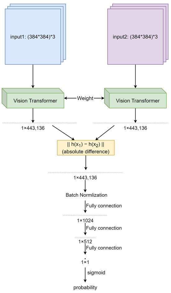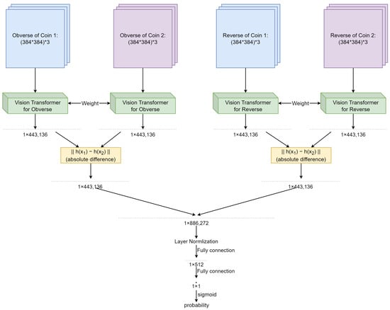 For the architecture of our obverse of reverse matching Single Siamese ViT, we adopted and adapted a generic Siamese Network as follows. Firstly, the backbone network of the network was replaced with a pre-trained ViT. Next, the semantic layer outputs of the two ViT models comprising the network and corresponding to the two streams processing the two inputs (obverses or reverses being matched) were flattened, and the absolute distance between them computed. Then, three linear layers and one batch normalization layer were used to reduce the dimension and produce the provisional output. Lastly, this output was passed through the sigmoid function to obtain a quasi-probability match measure, i.e., a number between 0 and 1. The architecture of this network can be seen in Figure 3.
