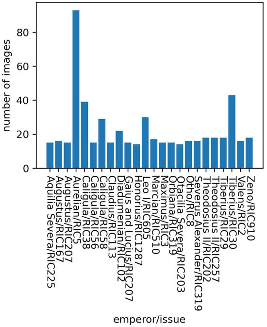 In contrast is the approach we advocate herein, whereby the machine learning model learns coin characteristics, which allows for the discrimination of same issues vs. different issues on a pairwise basis. The challenge of class imbalance is inherently avoided (with a caveat upon we will elaborate shortly), as is that of a large number of classes. However, a new practical choice emerges, that of designing the training process in a manner that is feasible. In particular, the space of possible training inputs (coin pairs) is enormous, totaling = 199,990,000 combinations. Even if only a single sample of each coin issue is considered, there are over = 24,496,500 combinations, which is clearly impractical. However, the inherent non-reliance of our approach on the presence of any specific issue allowed us a straightforward way of dramatically downsizing the actual training set. In particular, for training we considered only those issues containing over 20 samples. Out of these, we randomly chose 14 for training our model, 3 for validating it, and the remaining 3 for its final testing, these being entirely unseen during the training-validation process. Doing this resulted in a training set containing 542 images representing 24 issues, and the test data set for the evaluation of the final model consisting of a total of 7605 issues over 196 individuals (emperors, empresses, etc.) depicted on their obverses. Figure 5 shows the distribution of the training set.