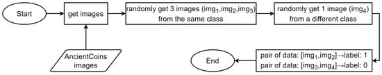 The process just described adequately addresses the challenges of a large number of classes, the consequent need for a vast amount of training data, and, partially, that of class imbalance. The latter challenge is at this stage overcome only partially because it is still the case that the number of all same-issue pairs still outnumbers the number of all different-issue pairs, risking the over-weighting of correct decisions when the input coins do belong to the same issue relative to the decisions when they do not. However, considering that the exemplar count of both is large, this remnant imbalance is resolved rather effortlessly. In particular, all that needs to be done and indeed what we did in this work, was to perform balanced sampling of same-issue and different-issue pairs. The flow chart of this process is summarized diagrammatically in Figure 6.