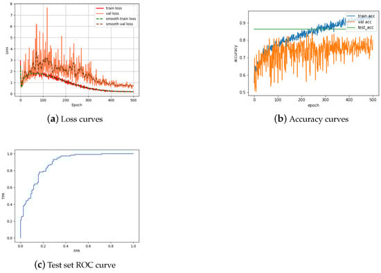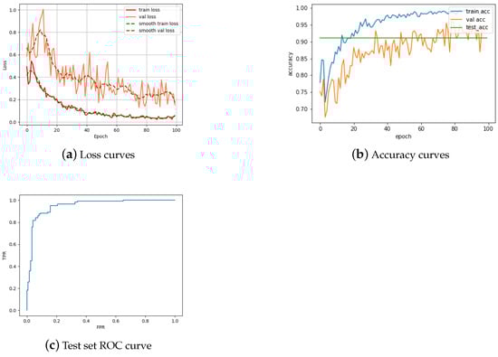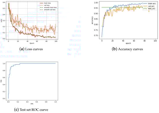 We turn our attention to the task of obverse matching first. As the plot in Figure 7a shows, save for stochastic oscillations, we observed a decrease in the training loss throughout the training process, that is, with additional training epochs. Nevertheless, the rate of loss decrease slows down significantly by epoch 100, which gives reassurance that not much further benefit would be conferred by longer training. The concurrent and mirroring behavior of the validation loss indicates successful learning and a well-fitted ultimate model. Indeed, evaluated on the test set, the model achieves the accuracy of 95.73%, which matches that of the final validation accuracy and is expectedly somewhat lower than the final training accuracy (see the accompanying plots in Figure 7b); the impressive corresponding ROC curve is shown in Figure 7c. Our test set accuracy significantly exceeds that achieved by previous work on the obverse matching task, e.g., that reported by a CNN-based approach of Schlag and Arandjelović []. Still, our result is even more astounding given that the exact problem addressed by Schlag and Arandjelović is weaker than ours: whereas they merely seek to match the depicted obverse persons’ identities, we tackle the more specific matching of the precise obverse issues, which requires not just the matching of the corresponding persons’ identities, but also of their dress and adornments, as well as obverse legends.