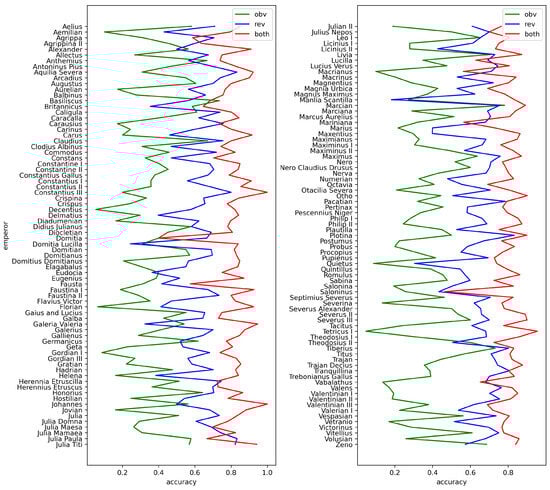 While our Double Siamese ViT model achieved outstanding results, vastly outperforming the existing state-of-the-art, it expectedly did not perform perfectly, i.e., it could not match a human expert on the task of coin issue matching. Hence, we sought to understand the model’s performance with more nuance and gain insight into its strengths and weaknesses, both being important for future work and any potential improvements to it. As the first step towards this goal, we performed an additional set of experiments. In these experiments, we sought to match issues using (i) obverses only and (ii) reverses only, using our Single Siamese ViT model, and compared the results on an emperor-by-emperor basis with the joint matching performed by the proposed Double Siamese ViT model. Note that the single-side-based matching done here was different than that described in the previous section. In particular, while in the previous section we also used the Single Siamese ViT model to perform single side matching (obverse or reverse), a match was considered correct if it matched that side correctly. In contrast, here we take the match to extend to the entire issue. Clearly, in general, the information from only one side of the coin is insufficient to fully specify an issue, though in some cases it is (some issues feature obverse or reverse motifs or details not found on other issues), which is why a human would always examine the coin in its entirety when performing attribution. That is precisely the value of the approach taken in this experiment. Specifically, by making an emperor-by-emperor comparison, our findings illuminate both the magnitude of the value added of a joint consideration of both coin sides, as well as give insight into when this is most helpful. For example, we expected that the greatest gain would be seen when an issuing authority on the obverse is featured on many different issues, as well as when a particular motif recurs over long stretches of time (this would be the case, for example, for generic propaganda about prosperity and the virtues of the Empire, but not with one-of-a-kind events such as military victories).