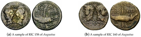 Lastly, a number of erroneous matches made by our method can be attributed to the inherent difficulty in distinguishing between certain issues that differ in minute detail only. An example is shown in Figure 15, which shows issues RIC 158 and RIC 160 of Augustus. These have identical reverses, with the legend COL NEM and the motif showing a crocodile chained to a palm-shoot with long vertical fronds and tip left, and a wreath with long ties above on the left. Their obverses are virtually identical too, with the legend IMP DIVI F and the heads of Agrippa (left) and Augustus (right) back to back (Agrippa wearing a combined rostral crown and laurel wreath, and Augustus laureate), the sole difference being the lettering P P in the field of RIC 160. We identified such only subtly different pairs of issues for Domitia, Saloninus, Macrianus, Fausta, Britannicus, Vabalathus, Julia Paula, Valentinian III, and Octavia.