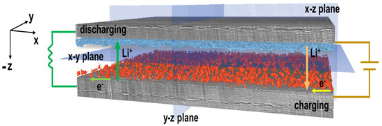 Cross- sectional images for the Li–polymer–Li symmetric cell; (a) cross section of the x–y plane where the training was completed on this plane; (b) cross sections of the x–z plane and detailing of the cell components; (c) cross sections of the y–z plane.