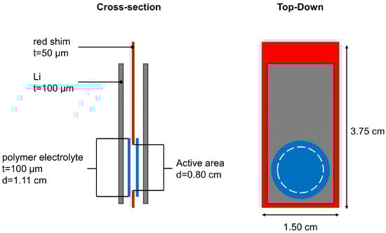 Free-standing Li metal foils with a thickness of 100 m from FMC/Livent™ were used. Polymer electrolyte membrane was sourced from an industrial partner with a thickness of 140 m as a research sample. The cell was assembled as Figure 3 shows. A red shim with a thickness of 50 m was used to create a circle with 0.8 cm diameter. Two circular polymer electrolytes with a diameter of 0.80 cm were punched out and placed on each side of the red shim. Two Li metal foils were then placed on the outside of the membranes as electrodes. The electrodes were connected to the metal tabs. The cell was sealed with a vacuum sealer. A current density of 1.5 mA/cm was periodically applied to the cell for 10 min, and the battery rested for 20 min. The cell was cycled at 3.0 mAh/cm for one full cycle (120 min for charging and 120 min for discharging), after which the cell XCT scan was acquired.