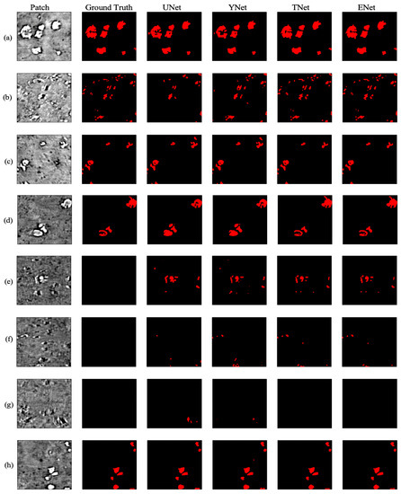 XCT cross–sections and corresponding segmentation results for U-Net, Y-Net, T-Net (TransforCNN) with inputs in 1st column characterized by: (a) high concentration of large Li agglomerates, (b) moderate concentration of small Li agglomerates, (c) low concentration of small Li agglomerates, (d) low concentration of large Li agglomerates, (e–g) low concentration of small Li agglomerates that were not labeled by humans but detected by the deep learning algorithms, (h) low concentration of small Li agglomerates.