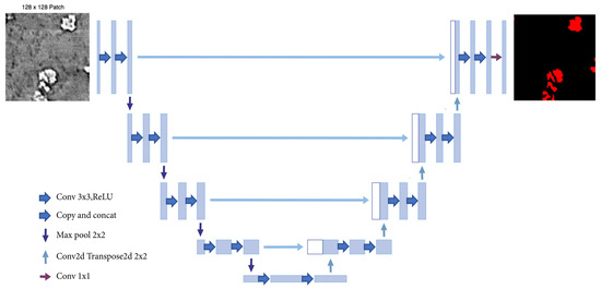 Figure 7 shows a U-Net, a CNN architecture that was first introduced in 2015 by Ronneberger et al. for the semantic segmentation of biomedical images. The original work [10] proposes an architecture that consists of a contracting path to capture context and a symmetric expanding path that enables precise localization. In our work, the model was adapted to take images of size as input. For the encoder, we started with 16-channel kernels and double the number at each layer, followed by a ReLU activation and max pooling until a 256-channel resolution feature map is obtained. We reversed the operation with transposed convolutions operation on the decoder side and concatenate with corresponding size encoder feature maps until the desired output shape is obtained.