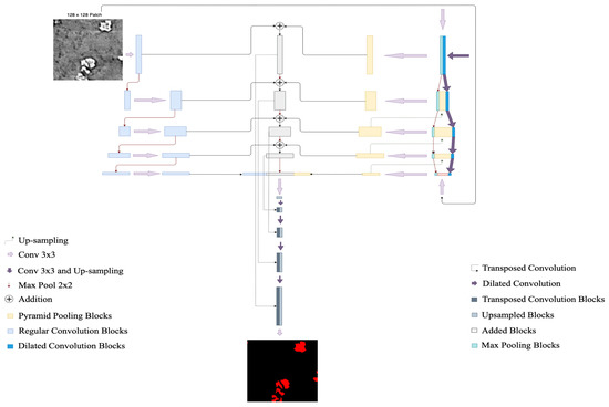 Many of these works [12,13,14,15] also leverage the atrous convolution to show that it could help to capture contextual information. In particular, Y-Net [15] used three modules to improve segmentation accuracy. In addition to the Regular Convolution Module and the Pyramid Pooling Module, which allows the model to learn global information about potential locations of the target at different scales, the Dilated Convolution Module took advantage of the fact that the target is often shared out in the samples, which supports learning sparse features in their structure. PSPNet [14], on the other hand, adds ResNet [16] as a backbone, while multi-scale feature maps are aggregated in its encoder.