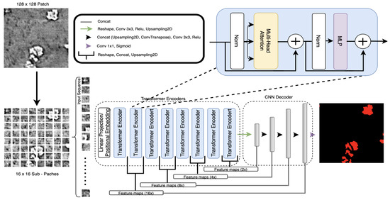 TransforCNN is a hybrid Transformer-CNN segmentation model that leverages the encoder model of Vision Transformers ViT [17] and the decoder architecture of CNNs. More specifically, its encoder model was first introduced in natural language processing (NLP) by Vaswani et al. [53] and its multi-headed self-attention was later shown (by ViT) to help remove the common inductive biases observed in CNN-only models by relating all input sequences with each other. As depicted in Figure 9, the proposed architecture is hybrid because it combines the Transformer Encoders Block with the CNN Decoder Block to deliver semantic segmentation.