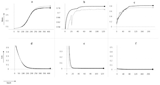 Training curves for U-Net, Y-Net, and TransforCNN on the y-axis vs. numbers of epochs on the x-axis; the models were optimized over the binary cross-entropy function as loss and evaluated on the Dice similarity coefficient as evaluation metric during training. The gray curves depict behavior on the validation sets while the black curves show behavior on the training sets over increasing numbers of epochs; (a) training and validation Dice coefficient for U-Net; (b) training and validation dice coefficient for Y-Net; (c) training and validation Dice coefficient for TransforCNN; (d) training and validation loss for U-Net; (e) training and validation loss for Y-Net; (f) training and validation loss for U-Net; the use of dropout during only the training phase explains why the models tend to perform better on the validation set over time.