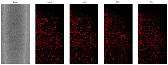 XCT cross-section along the x–y plane and corresponding segmentation results for U-Net, Y-Net, T-Net (TransforCNN), and E-Net.