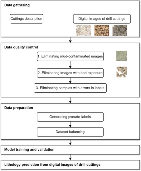 The developed workflow for predicting rock lithology from drill cuttings images is depicted in Figure 1 and includes the following principal steps: