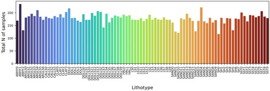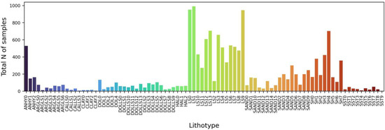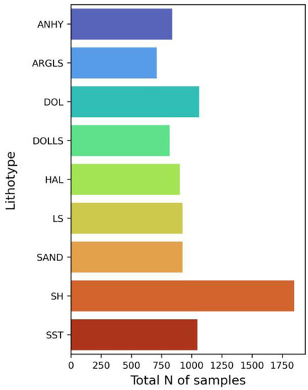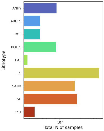 The gathered dataset exhibits a high degree of imbalance with respect to the total number of samples within distinct lithotypes (Figure 5). That imbalance is common for the study region. As can be seen from Figure 5, the dominant lithology is limestone, whereas the total number of samples for marl, clay, calcareous limestone, halite, siltstone, and dolomite is less than 1000.