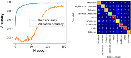 During the first experiment, the model for lithology prediction from cuttings images was trained without any data quality control and preprocessing. For training and validation, we took all images and randomly split them into train and validation subsets from the same wells. We applied standard augmentation techniques on the images, including rotation, shift, and skew with little color modification. The training history is depicted in the left panel of Figure 7, whereas the confusion matrix for the validation subset is presented in the right panel.