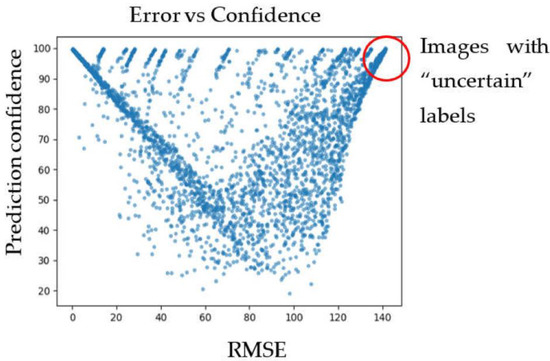 After that, we detected samples with problems with labeling. First, we applied a cross-validation technique: we divided all data into ten folds and performed training ten times, each time using one of the folds for model evaluation and the rest of the images for training. The uncertainly labeled images were those with a maximal error (when the model predicted a 100% single-lithotype image with the wrong lithotype) and highest predicted confidence. Figure 9 shows the plot of root mean square error (RMSE) versus prediction confidence for one of the runs. (Note that, in case a 100% single lithotype was misclassified, .) The uncertain images for all runs of cross-validation were marked as having uncertain labels.