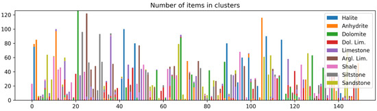 The model trained on sanitized data, after cross-validation, was used for image evaluation. To estimate how reliable the classification result can be, we applied clustering of the vectors embeddings of train images produced by this model. We applied the K-means clustering algorithm, where the number of clusters was estimated using the silhouette score after several clustering runs. The following Figure 10 illustrates the distribution of lithotypes in different clusters, where the number of clusters is equal to 150. The bar plot in Figure 10 shows the counts of samples in each cluster, and the color of the bars is attributed to different lithotypes. From this bar plot, we can see that each cluster can contain different lithotypes and a different count of samples of the lithotypes.