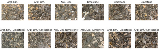 Cluster with 72 samples of argillaceous limestone and 17 samples of limestone (top row, from train set; bottom row, from test set; true label in brackets). Here, visually similar images have different labels; therefore, labeling is not reliable.