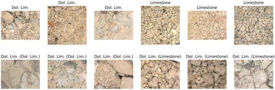 Cluster with 86 samples of dolomitic limestone and 83 samples of limestone (top row, from train set; bottom row, from test set; true label in brackets). Here, visually similar images have different labels; therefore, labeling is not reliable.