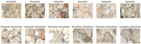 The clusters contain varying quantities of lithotypes, while images within each cluster exhibit visual similarities. Usually, visual similarity between two images can be estimated as the Euclidean distance between vectors embeddings. Consequently, we can assess the reliability of labels for each cluster. To accomplish this, we identified the lithotype corresponding to the maximum and second maximum number of images within a specific cluster. If the maximum number is substantially larger than the second maximum, we have a relatively uniform cluster, indicating that visually similar images are labeled with the same lithotype. To attribute a cluster to a set of ‘good’ or ‘bad’ clusters, we used a threshold of 0.1, meaning that if the maximum is 10 times greater than the second maximum, we count the cluster as ‘good’; otherwise, it is ’bad’ (non-reliable). The following figures (Figure 11, Figure 12 and Figure 13) illustrate several clusters: on the top row, images from the train set are given; on the bottom row, images from the test set with the predicted lithotype using the dominant lithotype of the particular cluster, where the true label is in brackets, are given.