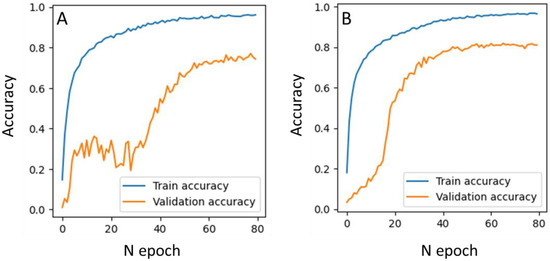 Accuracy curves for classifier training on the dataset without (A) and with (B) additional sublabels after data balancing.
