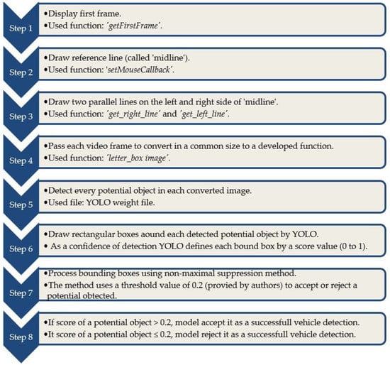 In this section, algorithms were developed to draw reference lines and detect vehicles in each video frame. The algorithms allow users to draw a reference line with simple mouse clicks when the very first video frame appears. The reference lines validate the program to make a successful vehicle count in the later steps. Though the detection of vehicles in each video frame was conducted by applying the converted YOLO weight file, a few algorithms were developed to execute the detection process, for example, the conversion of each image to a common size and providing threshold a value to identify potential detected objects. The total vehicle detection process is shown in Figure 1.