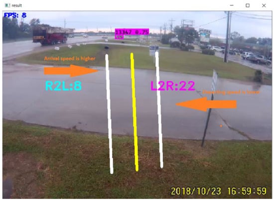 The algorithms determine the number and directions of counts based on the passing direction of the dotted center line through the mid-line and parallel line. For example, when the center line intersects the left parallel line first, the program confirms that the vehicle is coming from the left side. It can be assumed that the left side direction is the entry direction. Afterward, the program considers it a successful entry count when it intersects the mid-line. The developed ‘leftToright_counter’ and ‘rightToleft_counter’ functions count vehicles from the left and right sides, respectively.