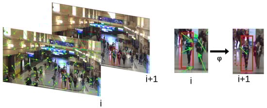 Visualization of utilizing motion vectors to propagate a prior set of detections from a source frame to a consecutive frame (Motion vectors are denoted with green arrows. Red squares denote the detection bounding boxes). The only motion vectors considered in the source frame i are those which fall within the area of the bounding box. The median perturbation of those motion vectors is computed and applied to the source bounding box in order to predict the bounding box in frame .