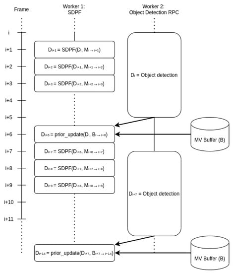 The SDPF requires a starting set of detections to propagate forward through the video. This particular set is known as the prior detection set, which is an estimate provided from a key frame inference. However, rather than evoke a computationally expensive and blocking DNN inference at a key frame, this inference is computed in parallel. The object detector runs in parallel with another worker which simply iteratively applies an SPDF following Equation (2) to the existing detection set at frame i.