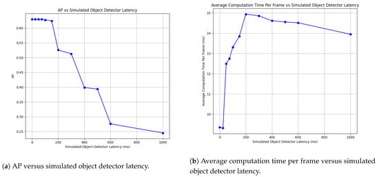 In order to evaluate the capabilities of this approach, two critical metrics were considered: average precision (AP) and average detection latency. The datasets used to evaluate these metrics were the MOT20 and MOT16 datasets [,]. The reason for using these datasets was that the data in this case were taken directly from the video and maintained the temporal context between images, unlike other object detection datasets. The MOT challenge series of datasets that MOT20 and MOT16 are a part of are widely used for benchmarking throughout object tracking []. Through the combination of these two datasets, a representative evaluation of performance in various scenarios was able to be quantified. Datasets such as KITTI [,] were not considered, since they are primarily based on automotive data and will not form a representative evaluation of performance across domains.
