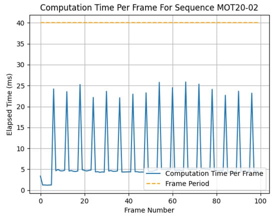 Shown in Figure 4 is the output latency per frame for MOVEX when predicting detections. In order for this technique to be considered real time, it must compute the results before receiving the next input. This threshold is denoted by for a sample MOT20 sequence shown on the graph. The spikes in latency are the points in the sequence in which a prior update occurred. These peaks in latency represent the lowest possible latency for which MOVEX could be considered real time. In this case, approximately 26 ms (corresponding to a frame rate of 38.46 fps) was the fastest real-time update rate possible with an object detector latency of 200 ms.