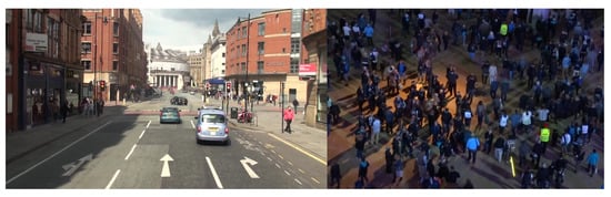 MOT20 maintains a consistent camera location throughout each video sequence but has many detection targets per frame, making it challenging in that regard. Dendorfer et al. created this dataset specifically to create a benchmark for evaluating object detectors and trackers in “...very crowded scenes in which the density can reach values of 246 pedestrians per frame” []. As mentioned earlier, the videos of this dataset were all taken from a static camera at a high vantage point, and they range in time from 17 s up to 2 min and 12 s. The video was recorded at various locations such as a train station, a crowded plaza, and a crowded parking lot, possibly after an event of some sort. All videos in this dataset are at a resolution except for one video sequence, which is [].