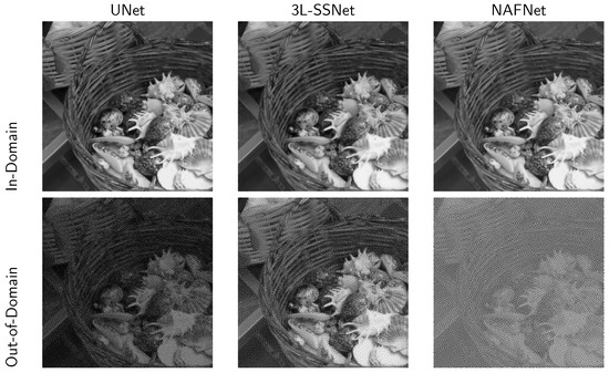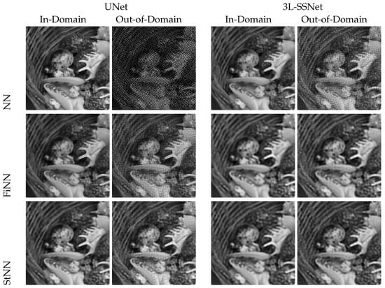 To this purpose, we visually compare the reconstructions of a single test image by the UNet and 3L-SSNet in Figure 5. The first row (which replicates some of the images of Figure 4) shows the results of the deep-learning-based reconstructors, where the out-of-domain images are clearly damaged by the noise. The FiNN and, particularly, the StNN stabilizer drastically reduce the noise, producing accurate results even for out-of-domain tests.