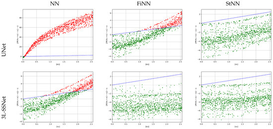 To analyze the stability of the test set with respect to noise, we have plotted in Figure 6, for each test image, vs. , where the reconstruction error is defined in (2). With green and red dots we have plotted the experiments with stability constants less and greater than one, respectively, and with the blue dashed line the bisect. We note that the values reported in Table 1 for the empirical stability constant computed as supremum (see Equation (18)) are not outliers but they are representative of the results of the whole test set.