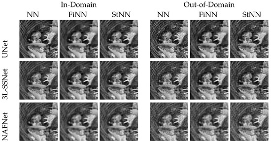 Figure 7 displays the reconstructions obtained by testing with both in-domain (on the left) and out-of-domain (on the right) images. Even if the NN reconstructions (column 4) are not so affected by noise as in experiment A (see Figure 4), however, noise artifacts are clearly visible, especially in UNet and NAFNet. Both the stabilizers proposed act efficiently and remove most of the noise. We observe that the restorations obtained with FiNN are smoother but also more blurred with respect to the ones computed by StNN.