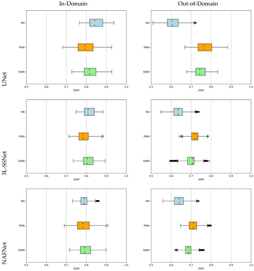 An overview of the tests is displayed by the boxplots of the SSIM values sketched in Figure 8. The light blue, orange, and green boxes represent the results obtained with the NN, FiNN, and StNN methods, respectively. They confirm that the neural networks’ performance worsens with noisy data (see the different positions of light blue boxes from the left to the right column), whereas the proposed frameworks including FiNN and StNN are far more stable.