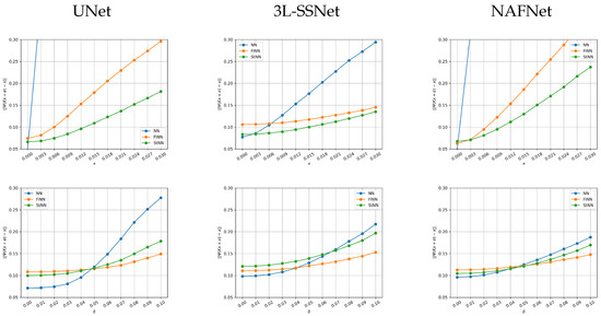 In Figure 9, we plot, for one image in the test set, the absolute error between the reconstruction and the true image vs. the noise standard deviation . In the upper row, the results from experiment A (we remark that in this experiment we trained the networks on non-noisy data) are shown. The NN error (blue line) is out of range for very small values of for both UNet and NAFNet, whereas the 3L-SSNet is far more stable. In all the cases, the orange and green lines shows that FiNN and StNN improve the reconstruction error. In particular, StNN performs best in all these tests.
