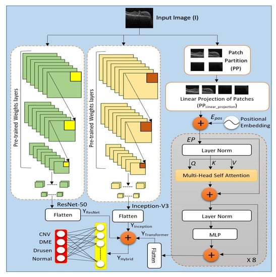 In this section, a detailed explanation of the working principle of the proposed Conv-ViT network is presented to classify the retinal disease into four classes from the OCT image database. In this approach for feature extraction, a triple stream network is employed, including Inception-V3 and ResNet-50 and vision transformer. The triple-stream network representation of the retinal database assists in identifying four retinal classes after passing through a deep neural network.