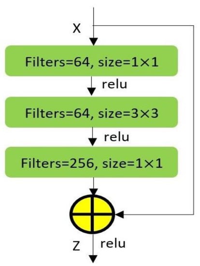 In addition to high-level feature extraction from the Inception-V3 model, the ResNet-50 is employed to focus on low-level features as well as using the residual connections in the architecture. During convergence, the Inception-V3 network performance gets saturated and degrades a bit after that [26]. To tackle these problems, this work introduces ResNet-50 for the feature extraction process. In the ResNet-50 architecture, there are 50 layers within five blocks. For each of these blocks, the residual function, F contains three convolution layers as shown in Figure 3 with dimensions (1 × 1), (3 × 3), and (1 × 1). The output, Z, of this block is calculated by adding the input, x, with the residual function, F, as represented in Equation (3). Where the residual function F updates the input x with a weight matrix Wi of three consecutive convolution layers. During feature extraction, the input image, I, with shape (84 × 84 × 3), is fed to the ResNet-50 network, and the output of the conv5_block3_out layer, ResNetconv5_block3_out_layer is used for final classification. The texture feature, ResNetfeature_texture is then converted using a flattened layer to generate a 1D vector output of YResNet.