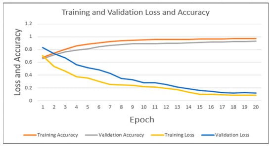 After training the model for 20 epochs due to GPU constrained, the test set is used to evaluate this model. The model is trained for approximately 3 h, which means each iteration takes about 10 min to complete. Figure 5 represents the variation of loss and accuracy in terms of epoch for the train and validation set. Overall, the accuracy curve for the training and validation set showed an upward trend, while the loss curve for the training and validation set displayed a downward trend. First, the training loss and validation loss are decreasing in nature, and the training loss and validation loss become almost constant in nature after 14 epochs. The variation in this duration of the first 14 epochs is 0.70~0.13 and 0.83~0.18 for training loss and validation loss, respectively. In terms of training accuracy and validation accuracy, the curves displayed an increasing trend till 14 epochs, and after that, the curves almost plateaued. In this duration of 14 epochs, the training accuracy varies from 67.51% to 96.13%, and validation accuracy varies from 65.82% to 90.64%. After completing the training, the training and validation accuracy is 97.45% and 92.89%, respectively. On the other hand, the training loss is 0.0882, and the validation loss is 0.1232. In conclusion, Figure 5 displayed how the model trained and improved in terms of accuracy and loss during the first 14 epochs, and beyond 14 epochs, the accuracy and loss curves plateaued, which indicates the model had converged after this certain period.