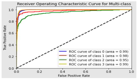 In quantitative analysis, the performance of the model is evaluated and analyzed using the quantitative value of four metrics. The model performance is evaluated using the test set. In terms of the test set, the model shows an overall accuracy of 94.46%. The precision and recall of the model are found to be 0.9447 and 0.9425, respectively. The F1 score is achieved at 0.9436. In addition, the class-wise performance of the Conv-ViT model is evaluated, as summarized in Table 4, due to highly imbalanced dataset distribution. The highest F1 score of 0.98 is found for the NORMAL class, and the lowest score of 0.78 is obtained for the DRUSEN class. The recall of the DRUSEN class is lower than the precision, which indicates that the false negative in the DRUSEN class reduced the model’s performance. On the other hand, the DME and CNV classes have an F1 score of 0.89 and 0.94, respectively. The weighted average of the F1 score is 0.94, whereas the macro average is 0.89. From Table 4, it can be observed that the highest precision, recall, and F1 score are found as 0.98, 0.99, and 0.98, respectively. Moreover, Figure 6 shows the AUC curve for each class with an overall accuracy of 0.98. In this case, class 0, class 1, class 2, and class 3 refer to CNV, DME, DRUSEN, and NORMAL, respectively. The figure shows that the lowest AUC score is 0.95 for the DRUSEN class. On the other hand, it is 0.99 for CNV and NORMAL classes. The AUC score is 0.98 for the DME class. The overall AUC score of 0.98 indicates that the model has a probability of 0.98 in the case of classifying a randomly chosen sample as positive higher than a randomly chosen negative instance.