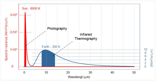 As previously mentioned, infrared thermography is a method of analyzing thermal radiation which essentially assigns a temperature designation depending on the characteristics and parameters of the environment. Therefore, in this contribution the term thermography refers to radiometric thermography which assigns a numerical value to the infrared thermal radiation. Note that this technical discipline is largely related to, but distinct from photography. In Figure 1, a comparison of the radiation power in the range of wavelengths that characterize those captured by cameras and IR cameras can be seen.