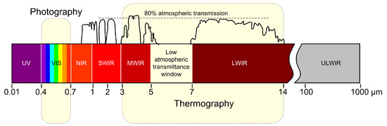 Both ranges in Figure 1 are electromagnetic radiation, and both obey the laws of optics. Nevertheless, thermal radiation can pass through opaque plastic objects, but not through glass, which is not an obstacle for visible radiation. The range of electromagnetic radiation most commonly associated with thermography is long-wave infrared (LWIR); the studies in this paper were conducted using a camera that detects radiation in the LWIR portion of the spectrum. Mid-wave infrared (MWIR) is associated with the analysis of higher-temperature objects that reach a maximum in this part of the spectrum due to the Wien displacement law [10], e.g., boilers, furnaces, and fire sources. Figure 2 shows the interval of electromagnetic radiation which is accessed by the means of thermography.