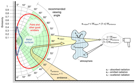 The radiation of the object detected by the IR camera depends on the viewing angle, as shown in Figure 3 by red and blue curves of the emissivity dependent on the viewing angle. Smaller angles should be avoided as they lead to wrong conclusions for surfaces with lower emissivity. In addition to the radiation from the object, the environment also emits radiation which is added to the total radiation detected by the camera. At greater distances, the hydrous atmosphere enters the total energy balance and absorbs some of the radiation detected by the IR camera as a scattering contribution to the total radiation detected. To put it bluntly, thermographic analysis is not a simple method and depends on proper calibration of instruments and determination of all recording parameters which may affect the measured signal.