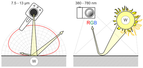 The main difference between a photograph and a thermograph can be seen in Figure 4. As mentioned in the introductory part, objects radiate in the infrared part of the spectrum depending on their internal energy that determines their temperature and emissivity. Furthermore, emissivity depends on the surface treatment and physical properties of the material, while a photograph is created by the reflection of light (excitation) from the surface of the observed object, a thermograph is created by active long-wave radiation of the observed object (Figure 4).