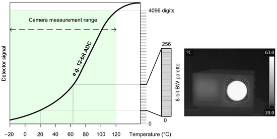 IR thermographic systems typically employ a broad dynamic range, typically ranging from 12 to 16 bits [10,11]. The basic principle of analog-to-digital conversion (ADC) is illustrated in Figure 5. This process shares similarities between photography and thermography but also highlights a fundamental distinction. In photography, pixels represent one of 16.7 million colors, whereas in thermography, pixels, which can have 255 distinct levels, correspond to specific temperature values. In this particular case, there are 140 possible temperature values (ranging from −20 C to 120 C which represents the total number of temperature differences). In essence, Figure 5 depicts the conversion and portrayal of a digital thermographic radiometric recording in the form of an image.